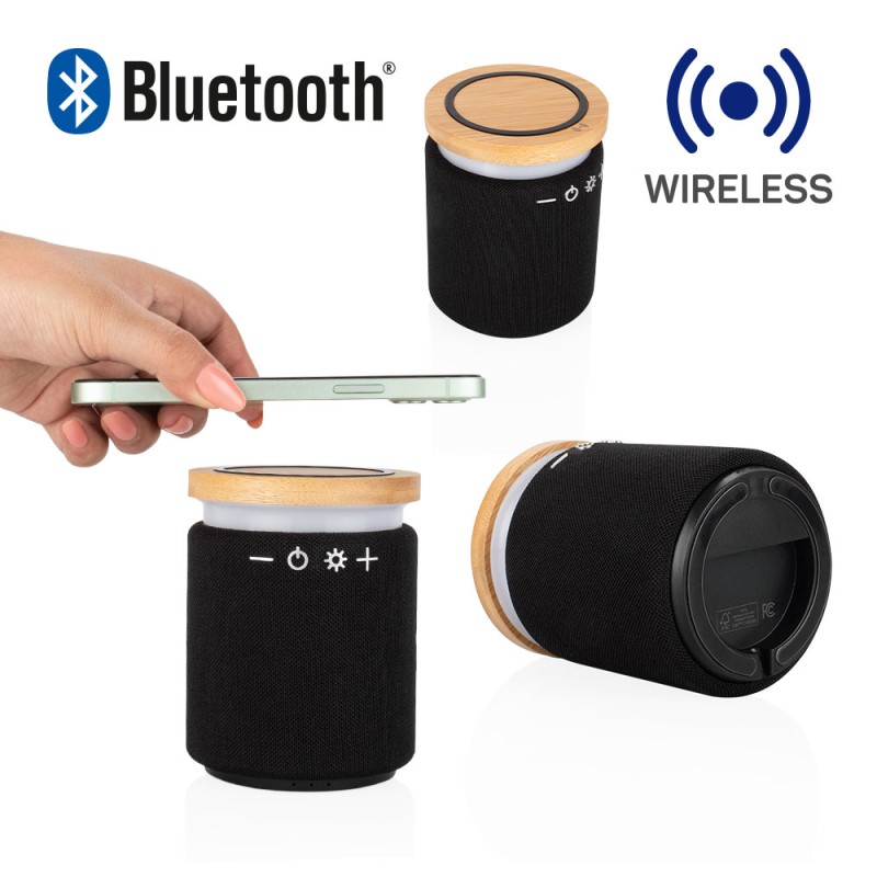 Altavoz inalámbrico con base de carga Qi de 10W que permite cargar dispositivos compatibles colocándolos sobre la superficie superior; cuenta con tecnología Bluetooth 5.1 para una conexi?